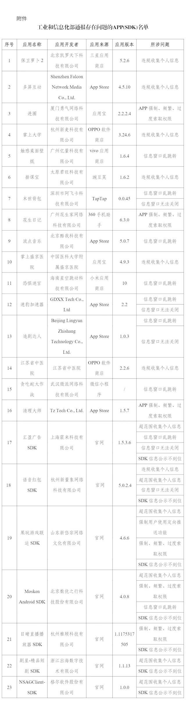 附件:工业和信息化部通报存在问题的APP(SDK)名单乐融配