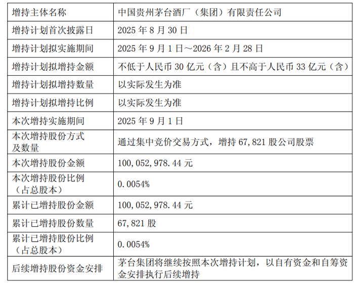 同期,8月29日晚,贵州茅台连续发布两则公告,披露公司顶额完成回购计划的详情以及控股股东增持计划。公告称,公司控股股东中国贵州茅台酒厂(集团)有限责任公司(以下简称“茅台集团”)计划自本次增持公告发布之日起6个月内,也就是在2025年9月1日至2026年2月28日期间,通过上海证券交易所系统以集中竞价交易方式增持公司股票财新网,拟增持金额不低于30亿元(含)且不高于33亿元(含),本次增持不设价格区间。